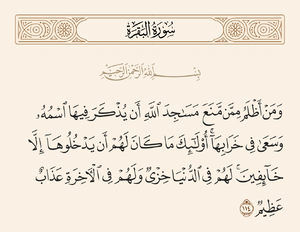 ﴿وَمَنْ أَظْلَمُ مِمَّنْ مَنَعَ مَسَاجِدَ اللَّهِ أَنْ يُذْكَرَ فِيهَا اسْمُهُ وَسَعَى فِي خَرَابِهَا أُولَئِكَ مَا كَانَ لَهُمْ أَنْ يَدْخُلُوهَا إِلَّا خَائِفِينَ لَهُمْ فِي الدُّنْيَا خِزْيٌ وَلَهُمْ فِي الْآخِرَةِ عَذَابٌ عَظِيمٌ ١١٤﴾ [بقره:114] ﴿و کیست بیدادگرتر از آن کس که نگذارد در مساجد خدا نام وی برده شود و در ویرانی آنها بکوشد آنان حق ندارند جز ترسان لرزان در آن [مسجد]ها درآیند در این دنیا ایشان را خواری و در آخرت عذابی بزرگ است ١١٤﴾