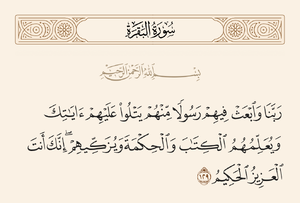 ﴿رَبَّنَا وَابْعَثْ فِيهِمْ رَسُولًا مِنْهُمْ يَتْلُو عَلَيْهِمْ آيَاتِكَ وَيُعَلِّمُهُمُ الْكِتَابَ وَالْحِكْمَةَ وَيُزَكِّيهِمْ إِنَّكَ أَنْتَ الْعَزِيزُ الْحَكِيمُ ١٢٩﴾ [بقره:129]|﴿پروردگارا در میان آنان فرستادهای از خودشان برانگیز تا آیات تو را بر آنان بخواند و کتاب و حکمت به آنان بیاموزد و پاکیزه شان کند زیرا که تو خود شکست ناپذیر حکیمی ١٢٩﴾