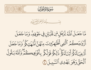 ﴿مَا جَعَلَ اللَّهُ لِرَجُلٍ مِنْ قَلْبَيْنِ فِي جَوْفِهِ وَمَا جَعَلَ أَزْوَاجَكُمُ اللَّائِي تُظَاهِرُونَ مِنْهُنَّ أُمَّهَاتِكُمْ وَمَا جَعَلَ أَدْعِيَاءَكُمْ أَبْنَاءَكُمْ ذَلِكُمْ قَوْلُكُمْ بِأَفْوَاهِكُمْ وَاللَّهُ يَقُولُ الْحَقَّ وَهُوَ يَهْدِي السَّبِيلَ ٤﴾ [احزاب:4] ﴿خداوند برای هیچ مردی در درونش دو دل ننهاده است و آن همسرانتان را که مورد ظهار قرار میدهید مادران شما نگردانیده و پسرخواندگانتان را پسران [واقعی] شما قرار نداده است این گفتار شما به زبان شماست و[لی] خدا حقیقت را میگوید و او[ست که] به راه راست هدایت میکند ٤﴾